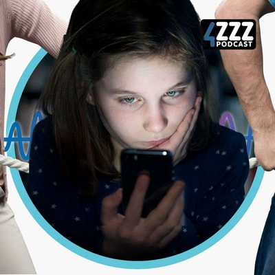 📸 ID: A child is sitting in the dark with the glow of a smart phone shining onto her face. On her left and right are two adults holding a rope pulling in opposite directions. The Tranzmission logo is in the background with the 4zzz Podcast logo in the top right foreground.